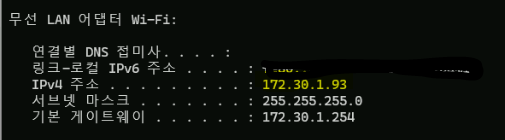 이후 CMD 창을 열어서 ipconfig을 입력한 후에 컴퓨터의 내부 IPv4 주소를 확인합니다.
