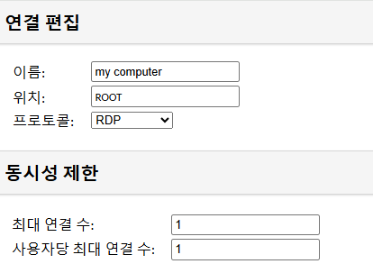 이제 Guacamole 웹페이지에서 세팅->연결->새 연결로 들어가서 아래와 같은 정보를 입력합니다.